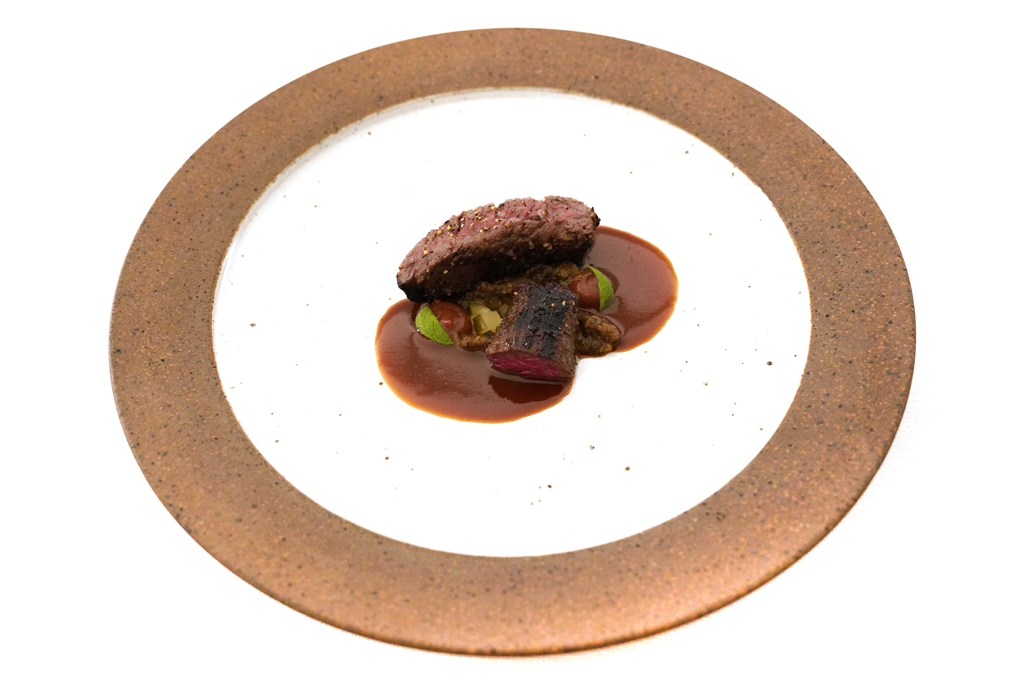7th course : “Harami” [17/20] – เนื้อวากิวส่วนกะบังลมย่างอย่างถูกต้องเสิร์ฟกับซอสยุซุโคโช เห็ดดรุกเซลล์และรูบาร์บ ถือเป็นเมนูเนื้อส่วนที่คนไม่ค่อยทานแต่ทำได้อร่อยมาก