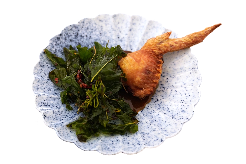 8th course : “Ka Pao” [18/20] – “ข้าวกะเพราะไก่” ในรูปแบบปีกไก่ยัดไส้ทอดที่ข้างในเป็นข้าวญี่ปุ่นผสมเนื้อไก่เสิร์ฟคู่กับใบกะเพราทอดกรอบและซอสกะเพรา