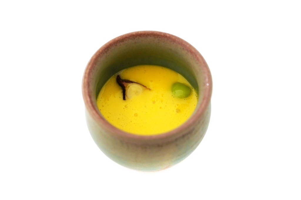 1st course : Saffron Soup [16/20] – ซุปครีมซัฟฟร่อนเนื้อละมุนหอมหวานที่เติมรสสัมผัสด้วยปลาหมึกยักษ์และถั่วแระญี่ปุ่น