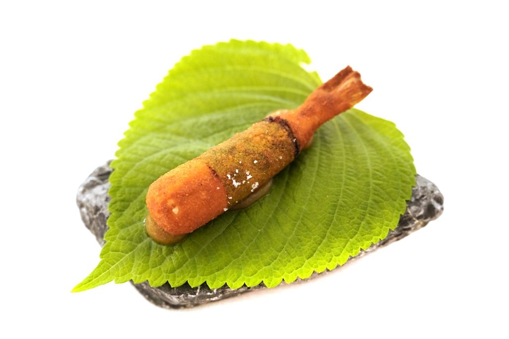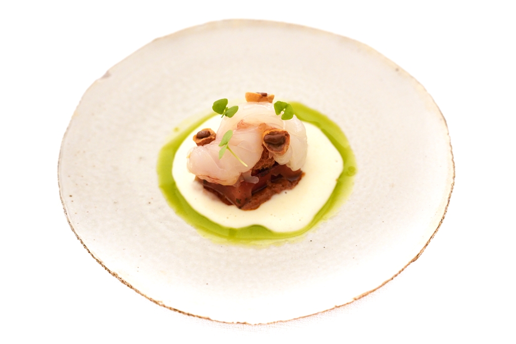 4th course : Botan Ebi [16/20] – กุ้งโบตั๋นเอบิเนื้อหวานเด้งเสิร์ฟคู่กับมะเขือเทศย่างบนซอสครีมชีสและน้ำมันใบเคอร์รี่ลีฟ