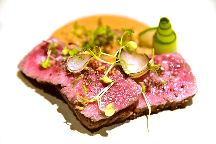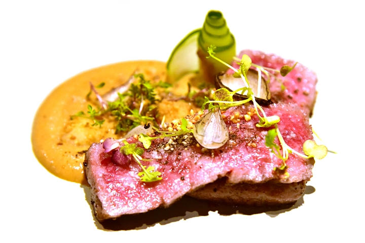 6th course: HOKKAIDO A4 WAGYU STRIPLOIN ‘beef satay’ (38 SGD supplement) – เนื้อวากิว A4 ย่างแบบแรร์เสิร์ฟคู่กับซอสสะเต้ะรสเค็มมันกลมกล่อมซึ่งเข้ากันได้ดีมาก