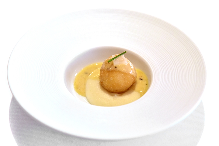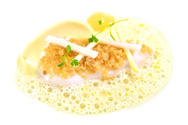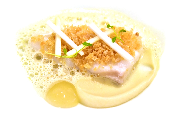 3rd course: PETERHEAD COD, celeriac, endive and apple, sauterness and curry sauce – ปลาค้อดเนื้อขาวเนียนในซอสครีมเครื่องเทศและแป้งกรอบ