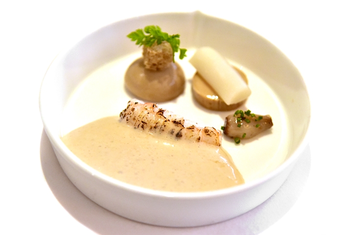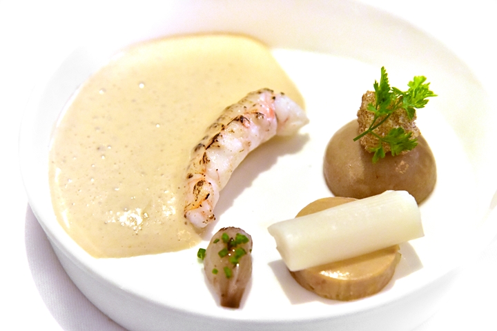 1st course: LANGOUSTINE, chicken liver parfait, white asparagus, confit onion, mushroom crouton – กุ้งแลงกุสตีนเนื้อหวานนุ่มเสิร์ฟคู่กับซอสครีมรสกลมกล่อม พาร์เฟต์ตับไก่ หน่อไม้ฝรั่งสีขาวและครูตองเห็ด