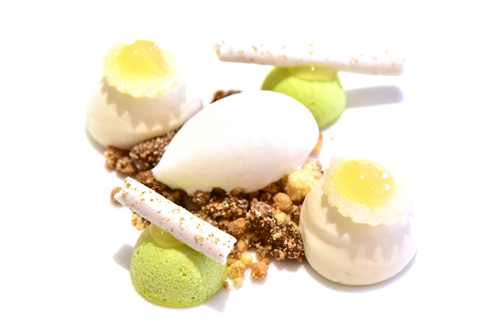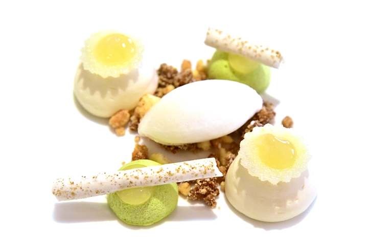 5th course: LONGLEY FARM SWEET BUTTERMILK MOUSSE, fennel sorbet, sorrel parfait, granny smith – มูสบัตเตอร์มิลค์เนื้อหวานนุ่มเสิร์ฟคู่กับซอร์เบตต์เฟนเนล แอปเปิ้ลเขียวและครัมเบิ้ล