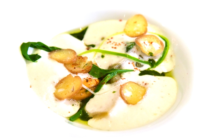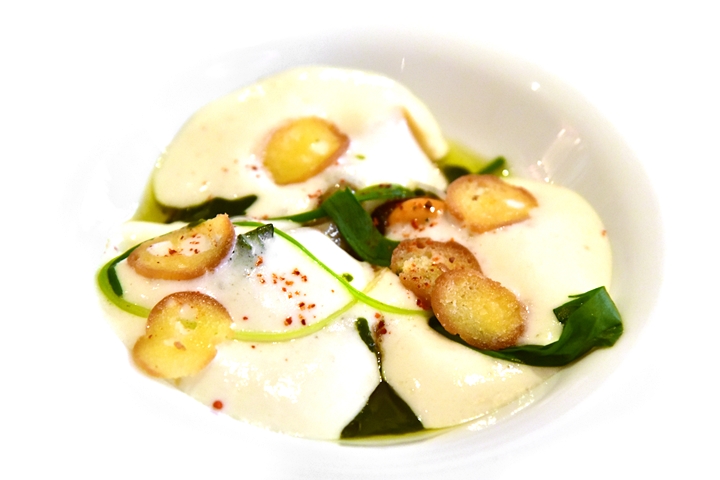 2nd course: RAVIOLI OF SNAILS, Shetland mussels, Ayrshire wild leek & garlic shoots, white onion veloute – ราวิโอลี่เนื้อหอยทากเสิร์ฟคู่กับครีมซอสรสเข้มข้นกลมกล่อมและหอยแมลงภู่เนื้อนุ่มละมุน