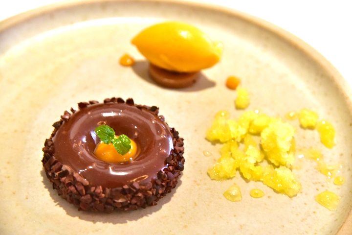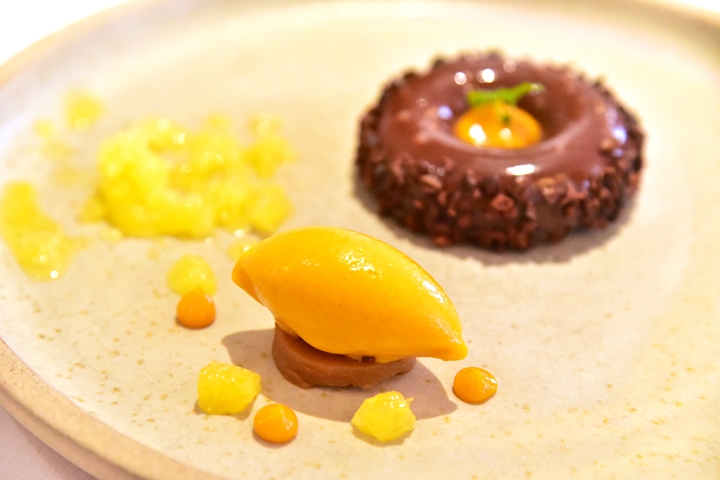 6th course: VALRHONA ALPACO CHOCOLATE MOUSSE, sea buckthorn, caramel delice, orange granite – มูสช็อกโกแลตรสเข้มข้นเสิร์ฟคู่กับกรานิต้าส้มและไอศกรีมผลไม้ที่มีชื่อว่า sea buckthorn