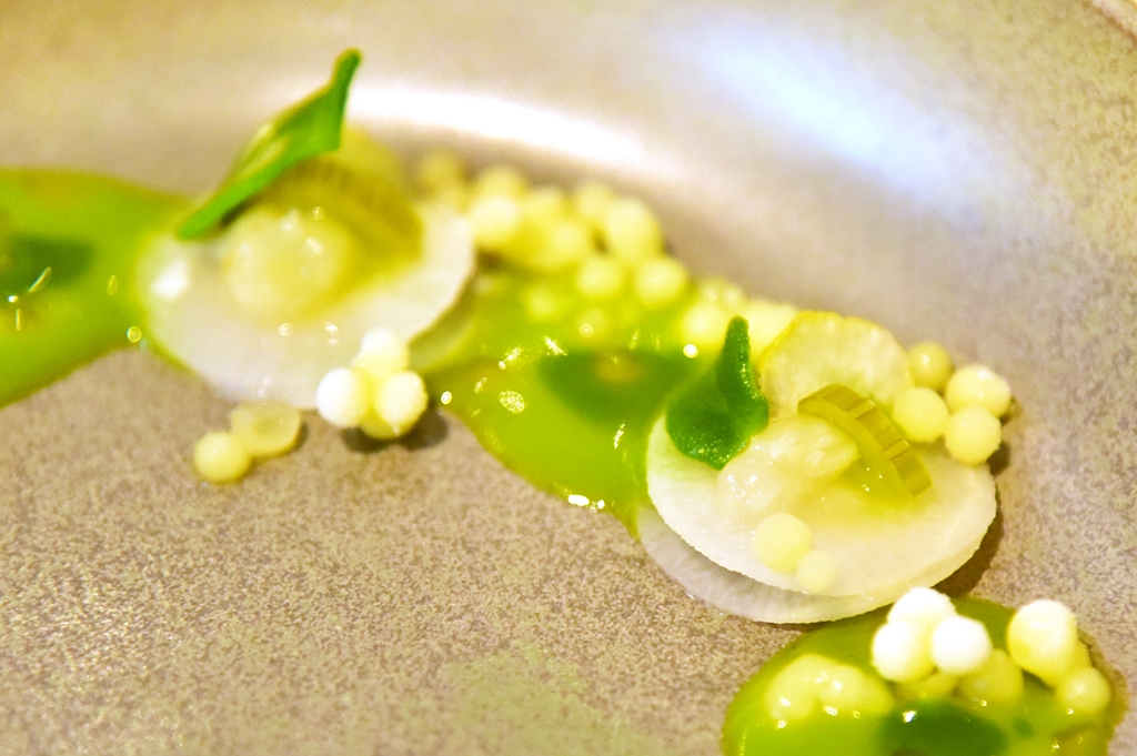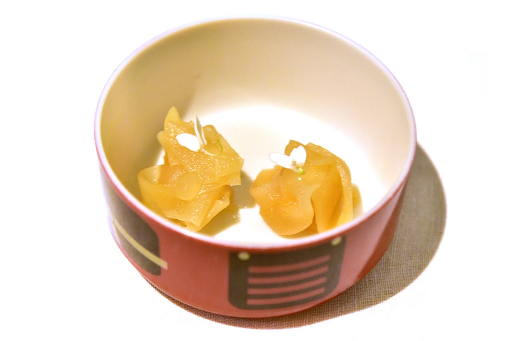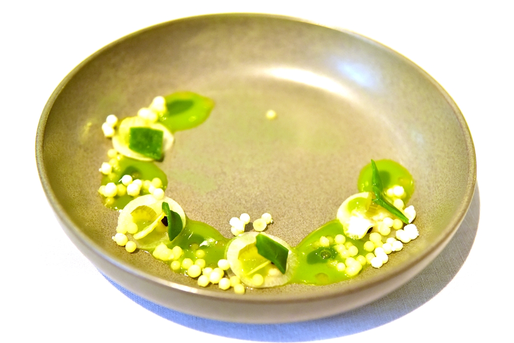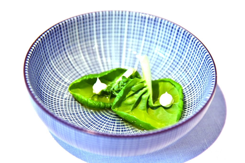 1st course: Parsley, Yuzu & Cordifole – การผสมผสานวัตถุดิบผัก สมุนไพรและส้มยูสุเสิร์ฟแบบเย็นหลากหลายรสสัมผัส สดชื่นดีมาก