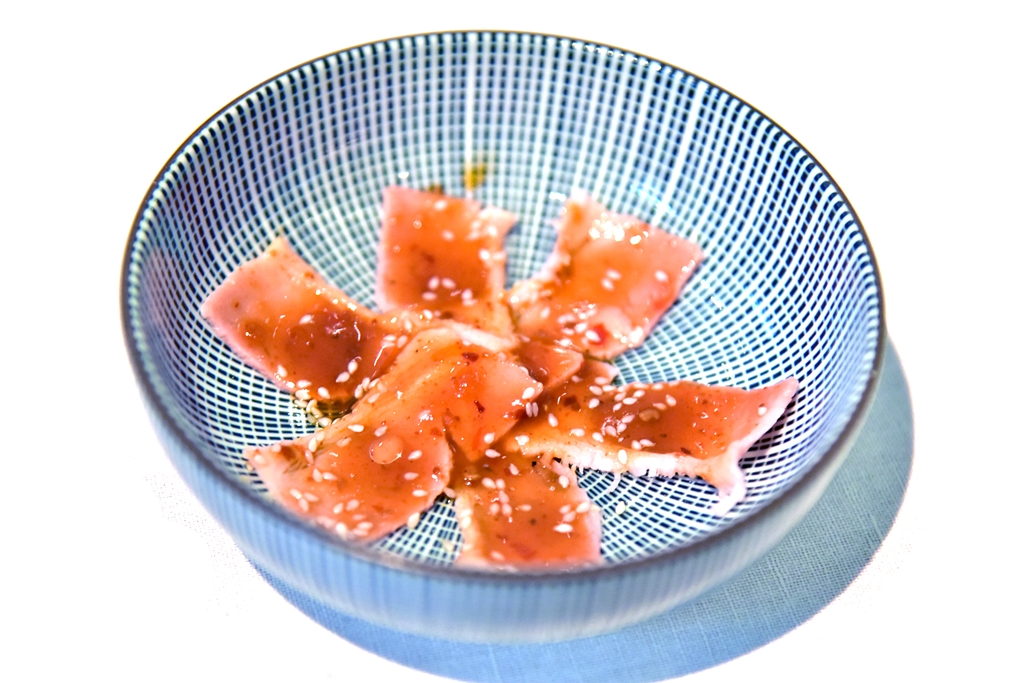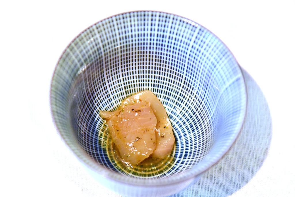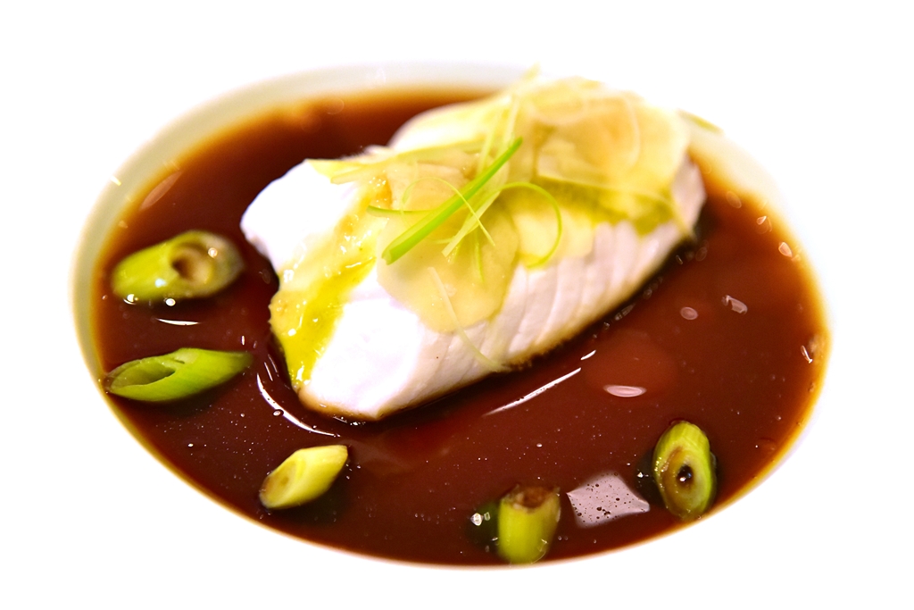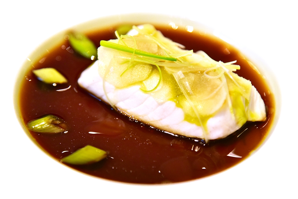 3rd course: Pikeperch, 10-year Kamebishi Soy, Leek & Ginger – เนื้อปลาไพค์เพิร์ชสีขาวเนียนเสิร์ฟคู่กับซอสซีอิ๊วอายุ 10 ปีที่รสชาติซับซ้อนยอดเยี่ยมจนอยากจะขอเอามาราดข้าวเลย !!
