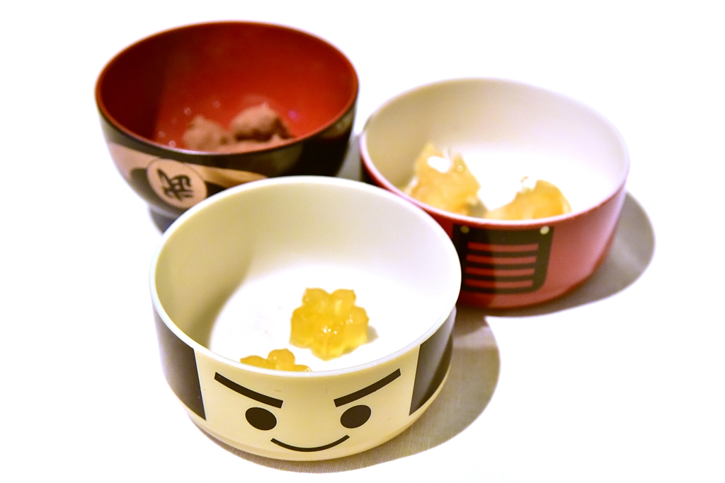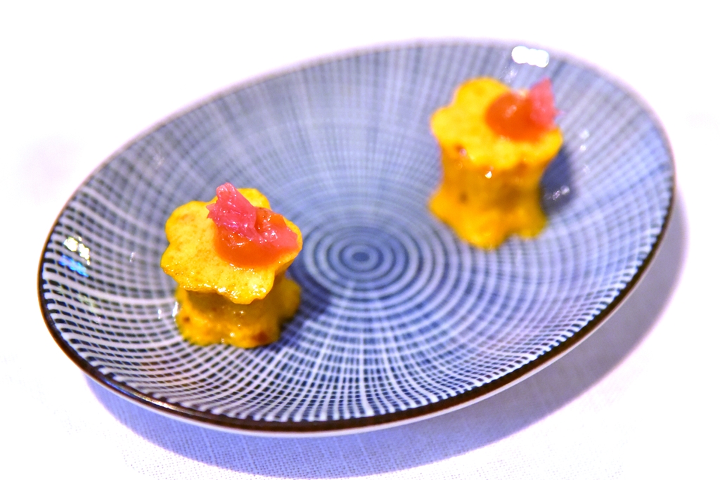 4th course: Wasabi Langoustine – เมนูซิกเนเจอร์ของเชฟ Tim Raue ที่ประกอบด้วยกุ้งแลงกุสตีนเทมปุระเนื้อหวานกรอบราดด้วยซอสวาซาบิรสเข้มข้นวางบนเจลลี่ซอสเปรี้ยวหวานที่เข้ากันได้ดี จานนี้นี่รสชาติจัดจ้านมาก
