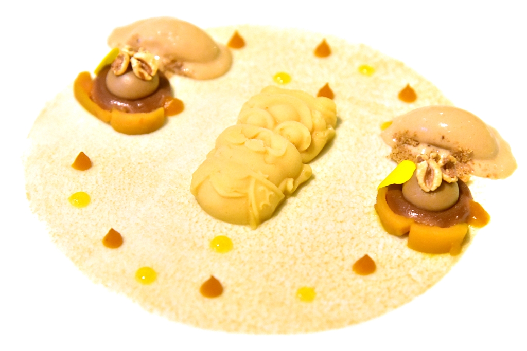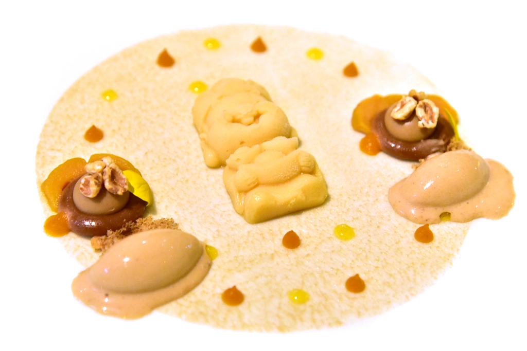 8th course: Medlar, Calamansi & Hazelnut – มูส “พระน้อย” รสผลไม้รสเปรี้ยวหวานเสิร์ฟคู่กับไอศกรีมและซอสคาราเมล