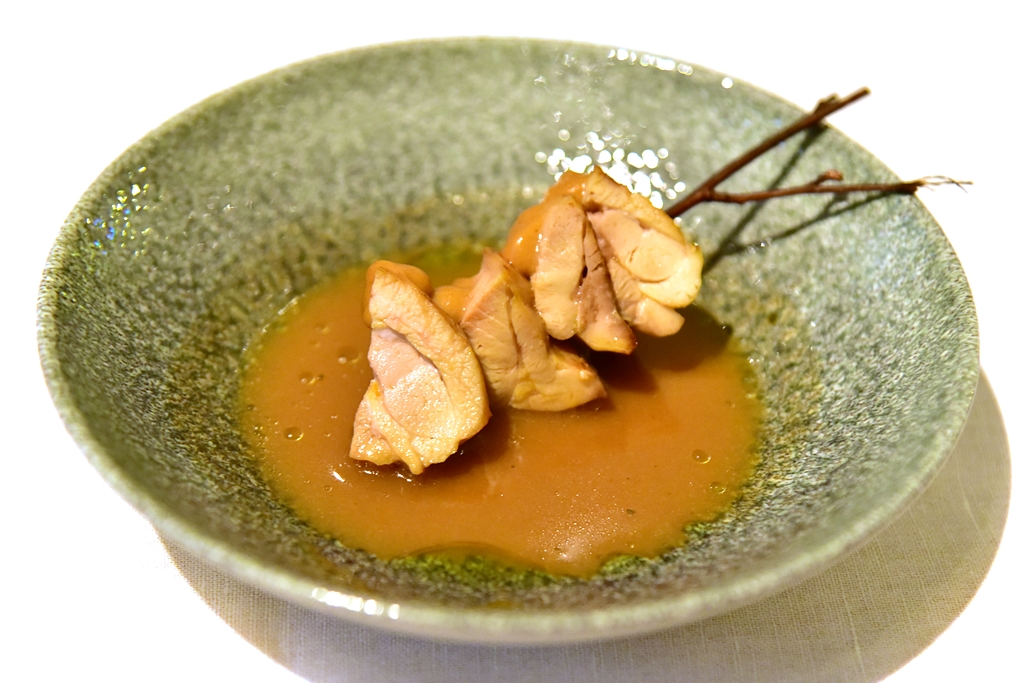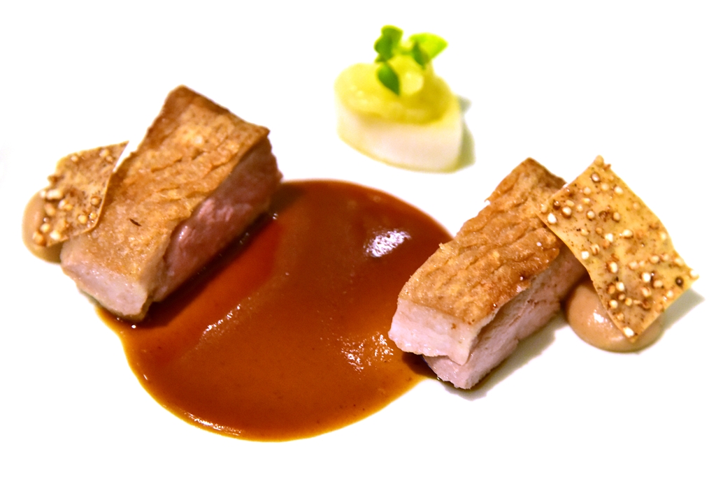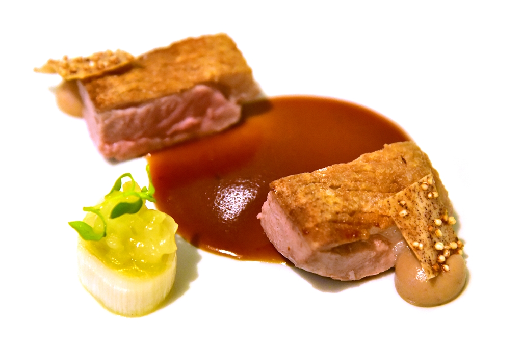 7th course: Peking Duck Interpretation – เป็ดปักกิ่งโฉมใหม่ ที่ประกอบไปด้วยเนื้ออกเป็ดย่างหนังกรอบเสิร์ฟคู่กับซอสเป็ดปักกิ่งเข้มข้น มูสตับเป็ดและซุปพะโล้เครื่องในเป็ด