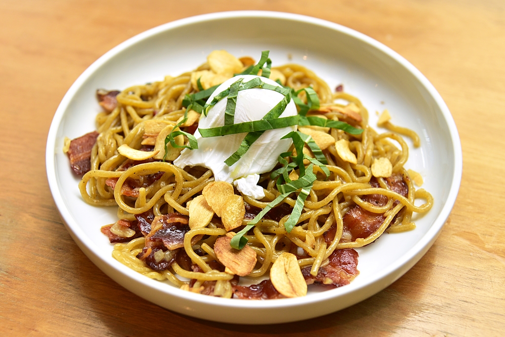 4. Bacon and Garlic (280++ THB) – สปาเก็ตตี้ผัดกระเทียมเบค่อนเสิร์ฟคู่กับไข่โพ้ชเอ้ก เมนูนี้ตัวเส้นสปาเก็ตตี้ทำออกมาคล้ายเส้นบะหมี่แบบจีนเลย อร่อยไปอีกแบบ