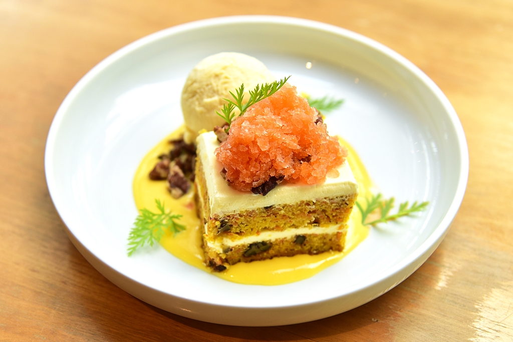 7. Carrot Cake (260++ THB) – แครอทเค้กเสิร์ฟคู่กับกรานิต้าแครอท ซอสเสาวรส ไอศกรีมครีมชีสและถั่วพีแคน