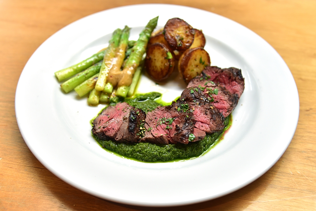 6. Hanger Steak (950++ THB) – สเต็กเนื้อรสเข้มข้นย่างมาได้กำลังดีเสิร์ฟบนซอสซัลซ่าเขียวคู่กับหน่อไม้ฝรั่งผัดเนยแดงโชวี่และมันฝรั่ง