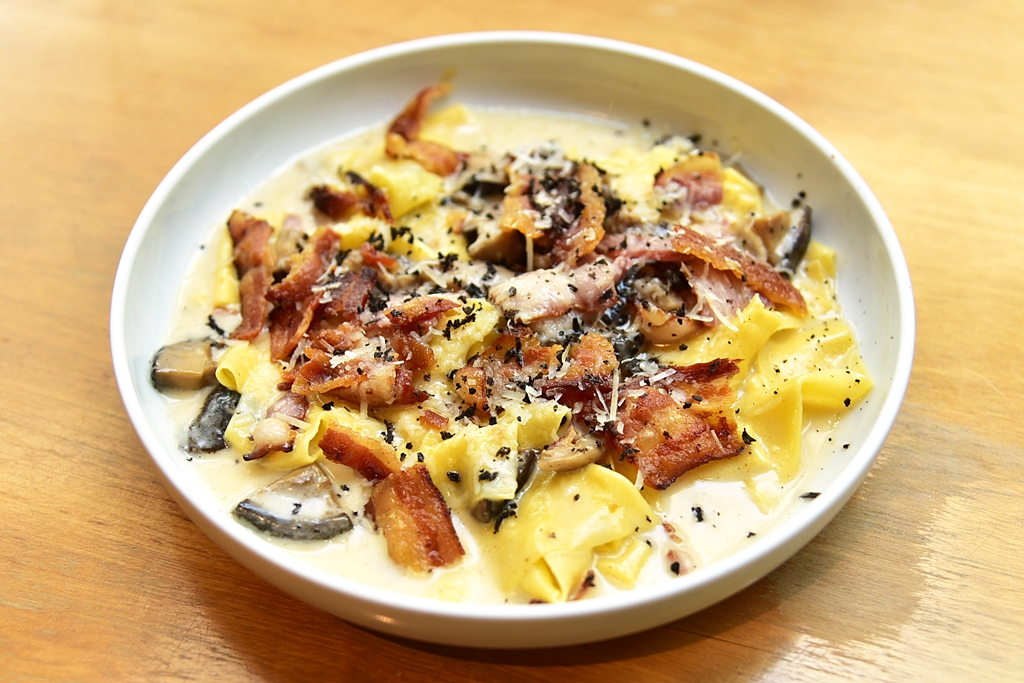 5. Truffle Alfredo (340++ THB) – พาสต้าเส้นใหญ่เนื้อนุ่มๆเสิร์ฟในซอสครีมเห็ดทรัฟเฟิลคู่กับเบค่อนและเห็ด