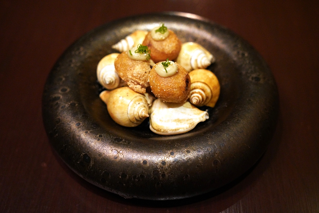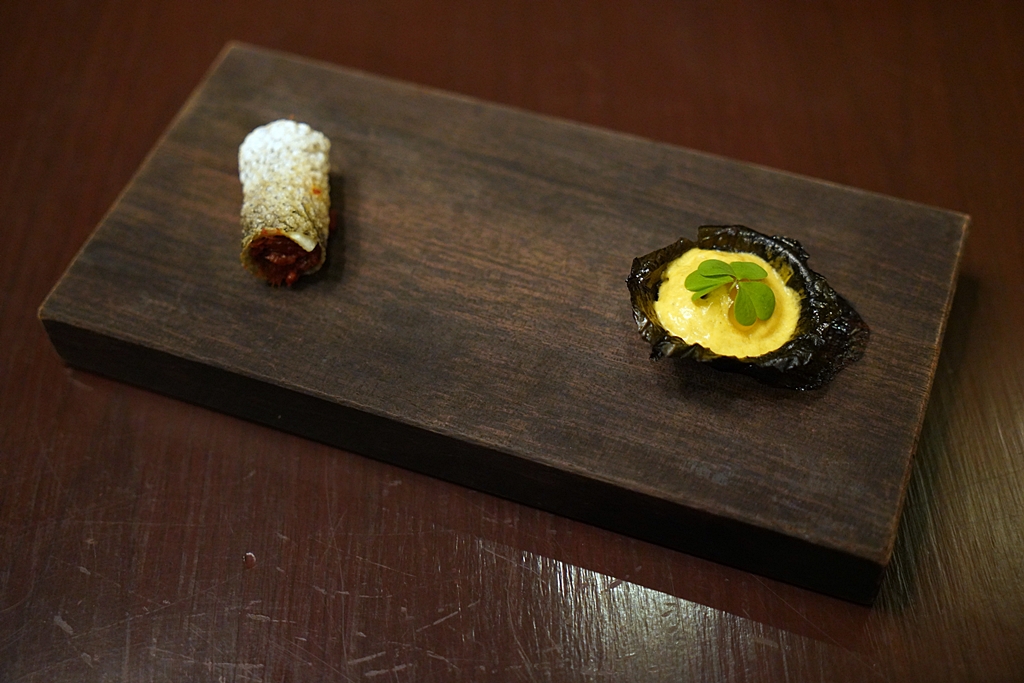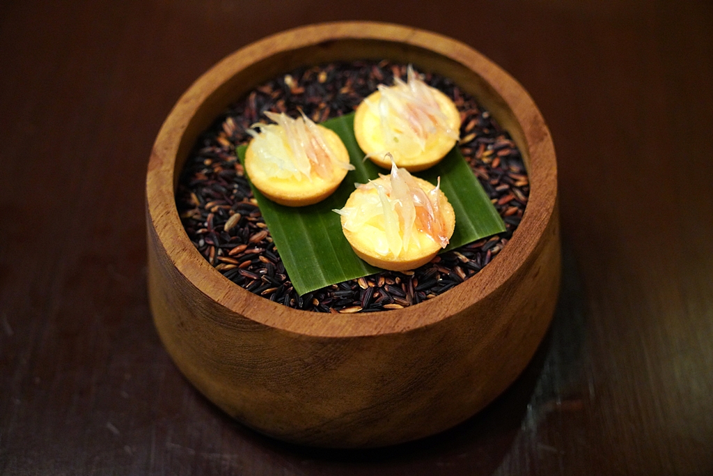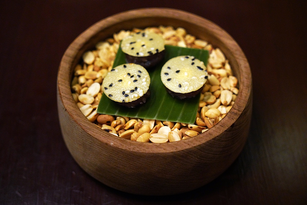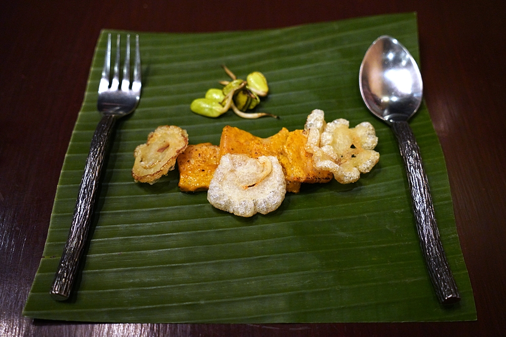 Amuse Bouche [16/20] – เมนูเริ่มต้นมื้ออาหารแบบ 4 คำที่ประกอบไปด้วย ห่อหมกใบยอเสิร์ฟแบบทาร์ต หนังปลากรอบน้ำพริกตาแดง ทองพลุไส้หอยชักตีนซอสข้าวคั่วและเงาะน้ำปลาหวานซอสมะแปม