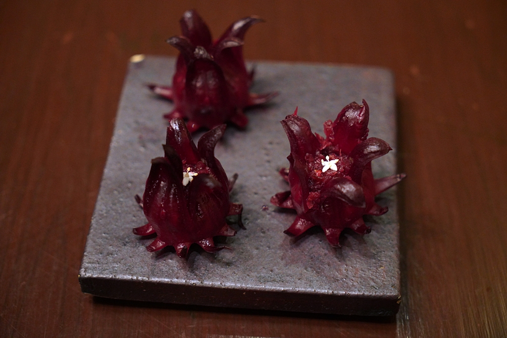 Palate Cleanser [13/20] – ยำกระเจี๊ยบดองผสมเนื้อปลาหมึกปรุงรสแบบเปรี้ยวนำยัดไส้กระเจี๊ยบแดงเพื่อล้างปาก
