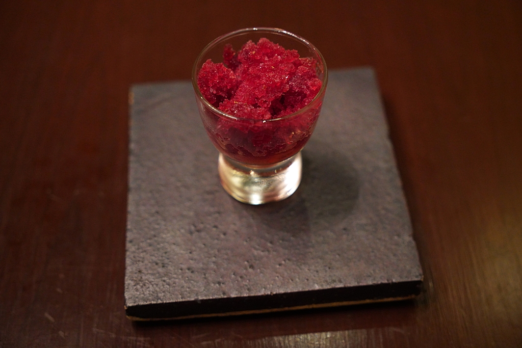 Pre-dessert [13/20] – เมนูล้างปากสำหรับของหวานที่ประกอบไปด้วยลูกไหนเชื่อมกับกรานิต้ากระเจี๊ยบ