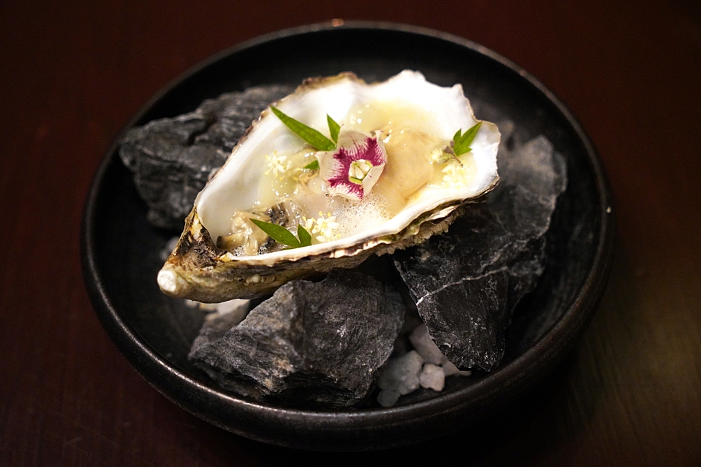 1st course : RAW | Utah Beach Jean-Paul Oyster | Som Saa | Oxystelma Flower [16/20] – “หอยนางรมดอง” ที่เชฟเลือกใช้หอยนางรมนำเข้าเนื้อเนียนละมุนดองกับน้ำมะขามเปียก น้ำปลา น้ำมะนาวและน้ำส้มซ่า