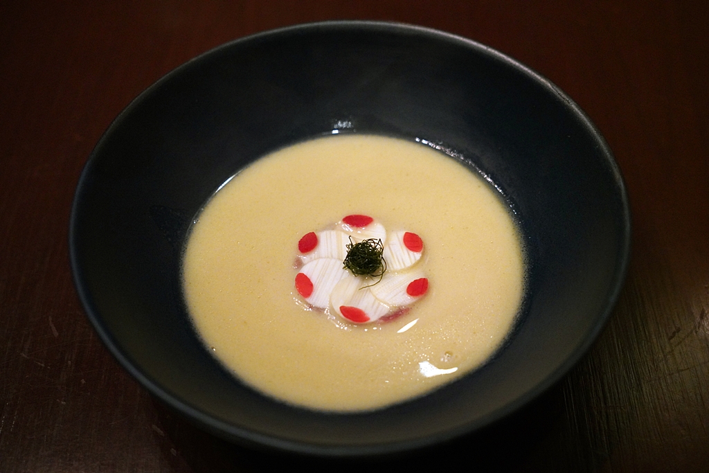 3rd course : BOILED | French Charolais Beef Araignee | Palm Heart | Pickled Sisaket Shallot [17/20] – “ต้มกะทิเนื้อเค็ม” ที่เลือกเสิร์ฟเนื้อชาโรเล่ส์แบบดิบในน้ำต้มกะทิเนื้อเค็มที่เคี่ยวกับพริกนานถึง 2 วันและเติมความเปรี้ยวหอมด้วยน้ำมะกรูด น้ำซุปกลมกล่อมมากๆ