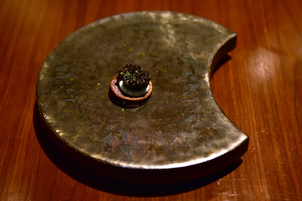 AMUSE BOUCHE – ขนมบ้าบิ่นมันม่วงเสิร์ฟคู่กับครีมต้มข่ารสเข้มข้นและไข่ปลาคาเวียร์รสเค็ม โรยหน้าด้วยเปลือกมะกรูด