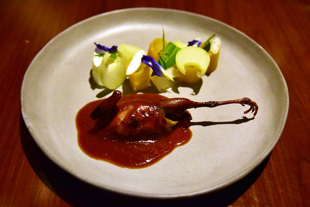 7th course: CHARCOALED | Nakhon Pathom Quail | Papaya | Sida Tomato – นกกระทาอบโอ่งเสิร์ฟคู่กับ “ส้มตำ” หน้าตาสุดแปลกประหลาดและซอสส้มตำมะเขือเทศรสชาติเข้มข้นเข้ากัน