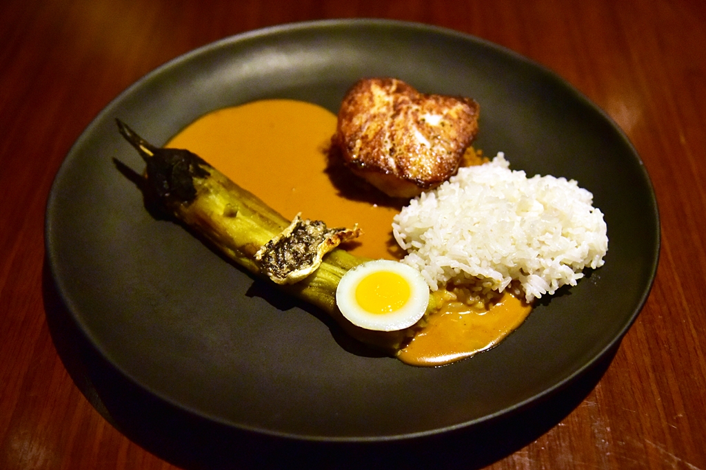 8th course: CURRY | Andaman Black Grouper | Panang | Eggplant | Phayao Jasmine Rice – เนื้อปลาเก๋าเสิร์ฟคู่กับแกงพะแนงรสชาติกลมกล่อมพร้อมด้วยมะเขือยาวเผาและข้าวหอมมะลิ