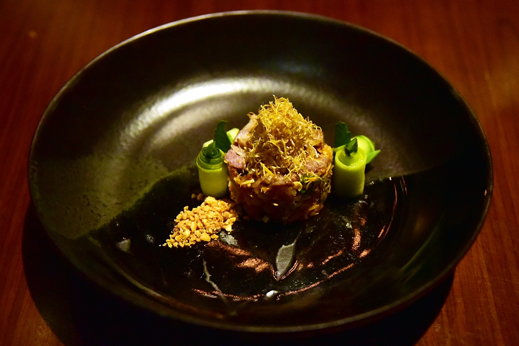 3rd course: FERMENTED | Black Pork | Pickled Cucumber | Thai Herbs – แหนมหมูคุโรบูตะทอดเสิร์ฟคู่กับแตงกวาดองโรยหน้าด้วยขิง