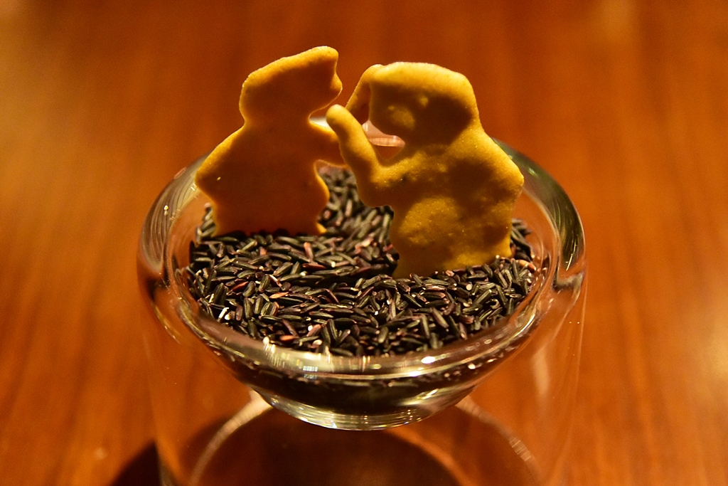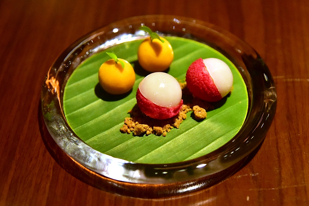 PETITE FOURS – ขนมหวานปิดท้ายมื้ออาหาร ได้แก่ เม็ดขนุนผลส้ม ลิ้นจี่กินได้ทั้งเปลือกและคุกกี้มะกรูดรูปหนังตะลุง