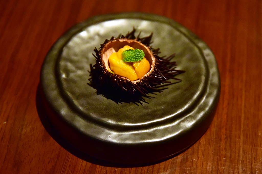 1st course: RAW | Sea Urchins | Madan Fruit | Home Made Chili Jam – พล่ามะดันไข่หอยเม่นกับเครื่องแกงแบบไทยๆรสชาติเข้มข้น