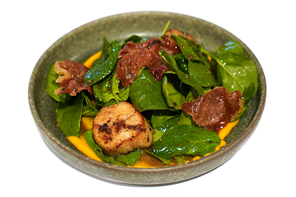 3. Insalata di Capesante (490++ THB) [16/20] – สลัดผักโขมในเดรสซิ่งเห็ดทรัฟเฟิลเสิร์ฟคู่กับหอยเชลล์ย่างตัวโต ปาร์มาแฮมทอดกรอบเนื้อเค็มอูมามิและพิวรีบัตเตอร์นัชสควอช ทุกอย่างเข้ากันได้แบบลงตัวมาก !!