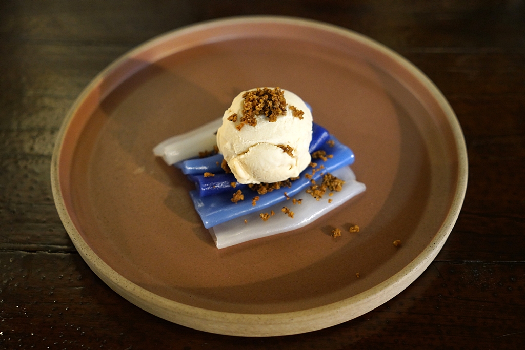 9. Khanom Chan (280++ THB) [15/20] – “ขนมชั้น” แบบ Samlor ที่ใช้แป้งขนมชั้นโมจิหนึบๆรสมะพร้าวกับอัญชันเสิร์ฟคู่กับไอศกรีมน้ำตาลมะพร้าวเคี่ยวรสหวานข้นและครัมเบิ้ลขี้โล้