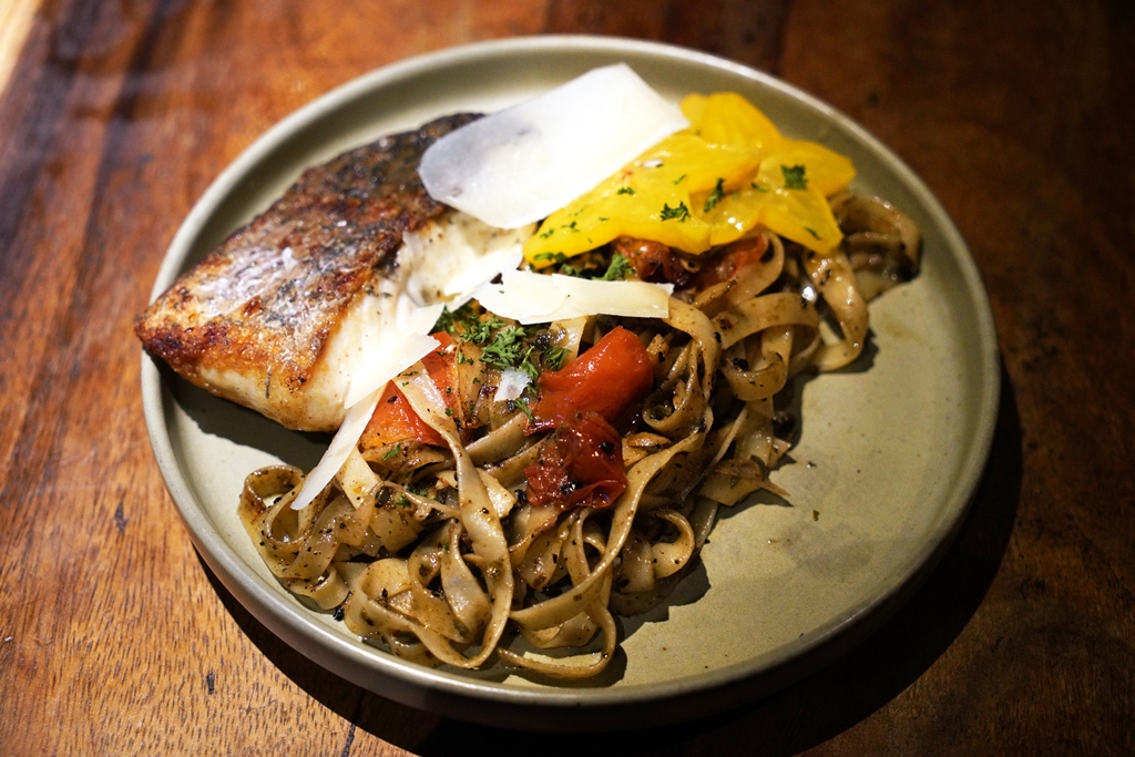 4. Seabass Puttanesca (26++ SGD) [16/20] – พาสต้าเส้นแบนผัดกับเคเปอร์และแอนโชวี่เสิร์ฟคู่กับสเต็กปลากระพง มะเขือเทศและมะเฟืองดอง