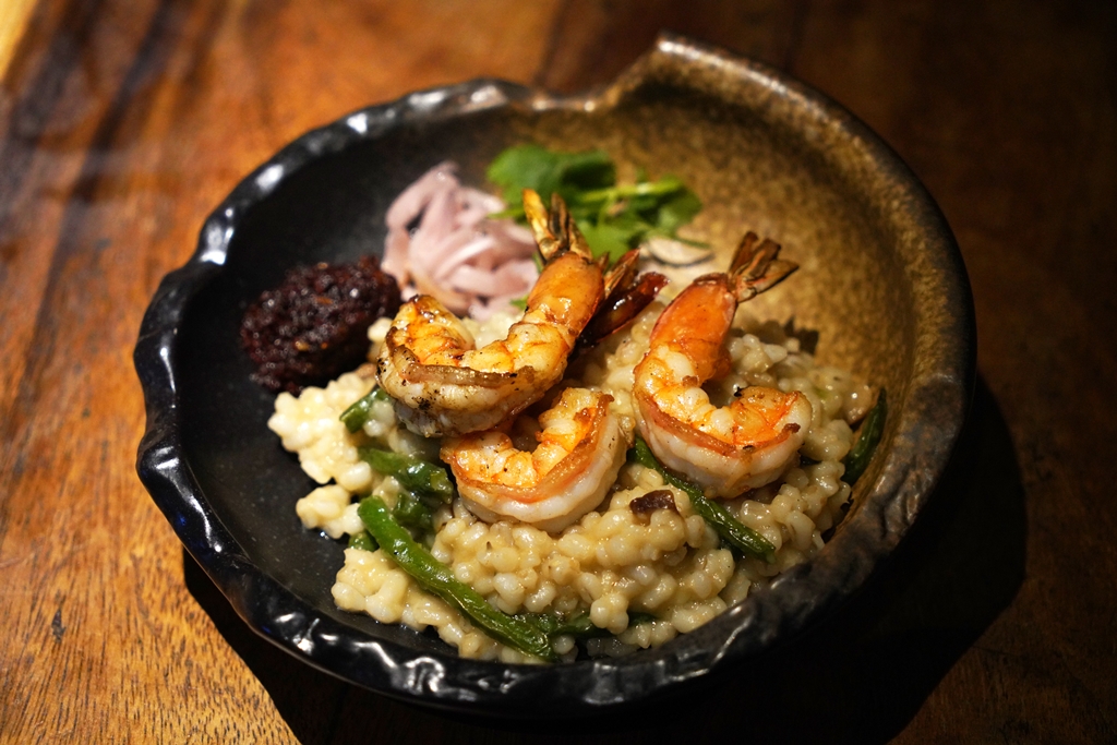 5. Seafood Glace Risotto (26++ SGD) [15/20] – ริซอตโต้ข้าวบาร์เลย์และซอสเดมิเกลซปลากระพงคู่กับปลาหมึก กุ้งย่างกระทะและเห็ดโดยเติมความรสชาติด้วยน้ำพริก