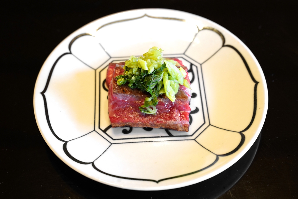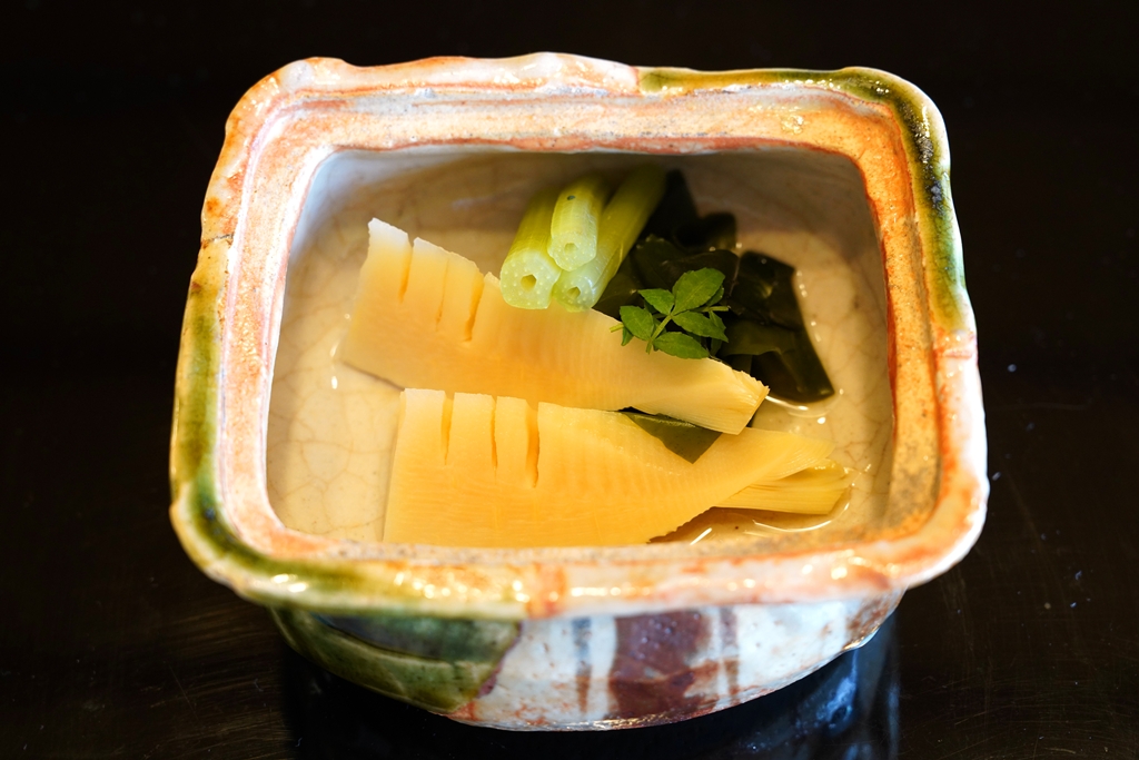 6th course : Simmered Bamboo Shoot, Seaweed, Butterbur, Japanese Pepper Leaf [15/20] – หน่อไม้ต้มเนื้อกรึบเคี้ยวเพลินเสิร์ฟกับสาหร่ายวากาเมะและก้านผักฟูคิโนะโต เป็นเมนูแบบเบาๆรสอ่อนๆสไตล์ญี่ปุ่น