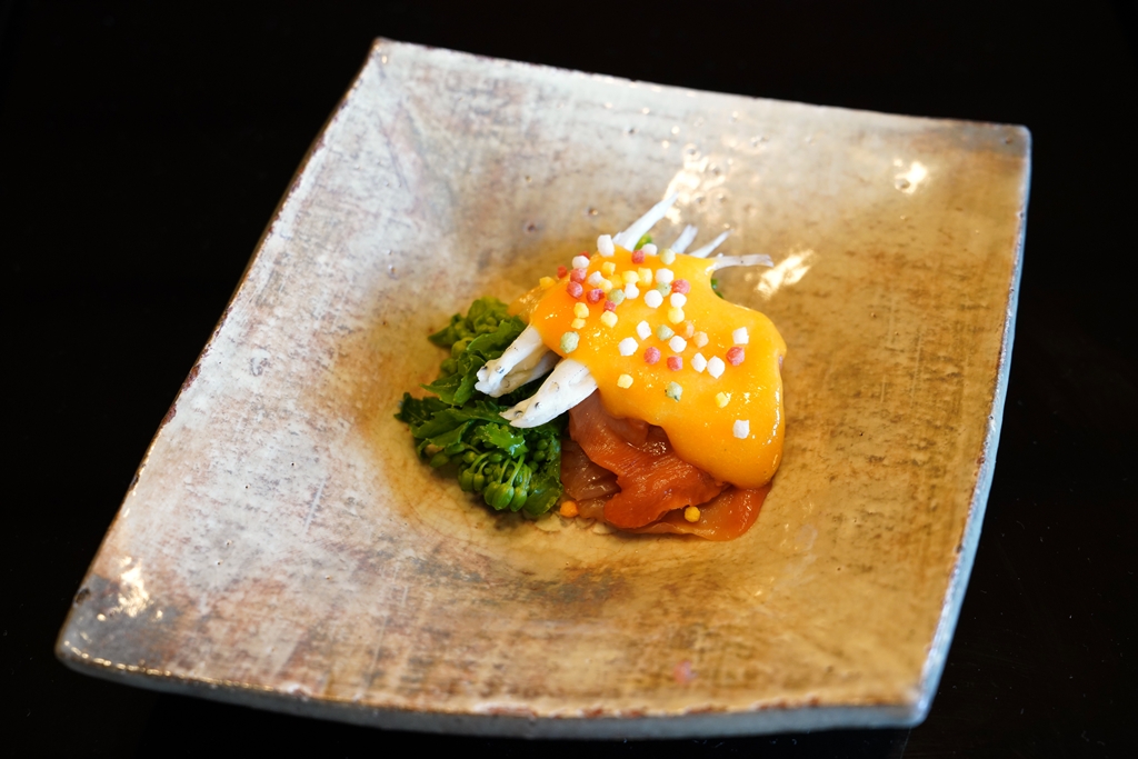 8th course : Simmered Icefish, Ark Shell and Canola Flower seasoned with Egg Yolk Vinegar Sauce [13/20] – ปลาชิราอูโอะและหอยอากะไกเสิร์ฟกับผักกาดก้านขาวราดซอสไข่แดง เมนูนี้ส่วนตัวยังแอบเข้าไม่ถึงครับ