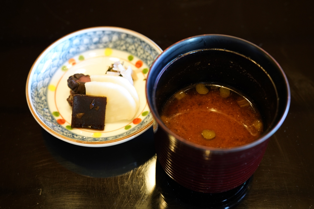 9th course : Grilled Wagyu Beef seasoned with Miso and Stem Wasabi, Steamed Hoshihikari Rice, Pickles and Miso Soup [17/20] – เซ็ตข้าวญี่ปุ่น ผักดองและซุปมิโสะเสิร์ฟคู่กับเนื้อวากิวย่างมิโสะและลำต้นวาซาบิ จานนี้ฟินปิดท้ายมื้อ ข้าวดี ซุปดี เนื้อดี