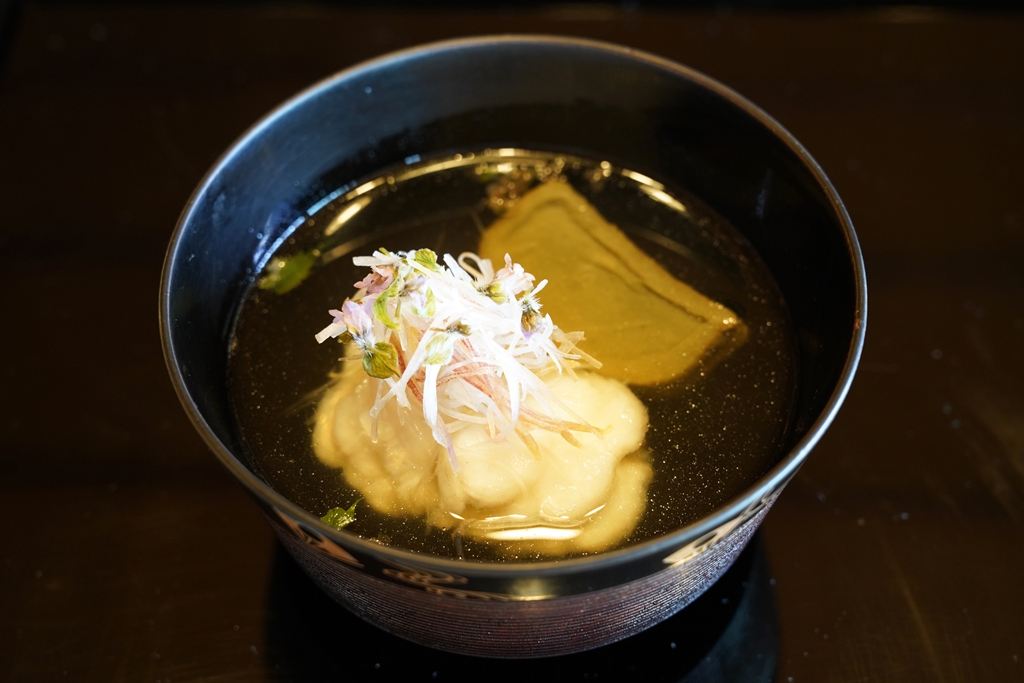 3rd course : Japanese Clear Soup with Greenling, Wheat Gluten, Udo, Myoga and Shiso [17/20] – ซุปใสแบบญี่ปุ่นรสอูมามิเสิร์ฟกับเนื้อปลา “ไอนาเมะ” เนื้อขาวเด้งและกลูเต็นเนื้อหนึบหนับ ถือเป็นซุปใสร้อนที่ซดคล่องคอมาก