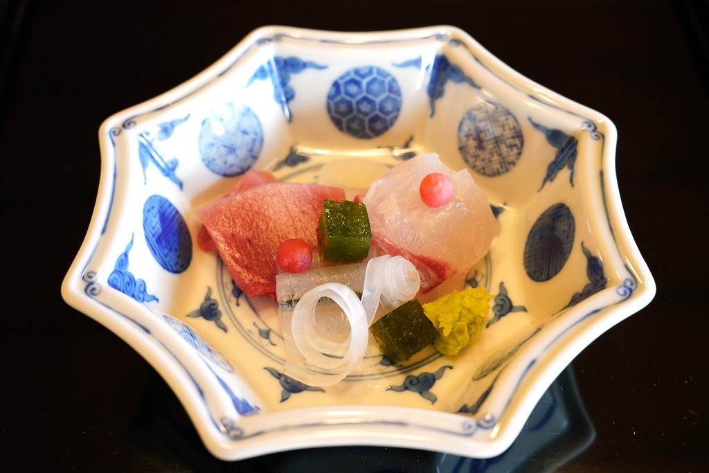 4th course : Sea Bream, Shibi and Halfbeak [16/20] – เซ็ตซาชิมิ 3 อย่าง ได้แก่ ปลาไท่เนื้อขาวเด้งหนึบ ปลาทูน่าส่วนท้องจากปลาทูน่าไซส์เล็กและปลาซาโยริ เสิร์ฟกับโชยุ พอนสึและสาหร่าย คุณภาพดีงามสมกับมิชลินสตาร์ครับ