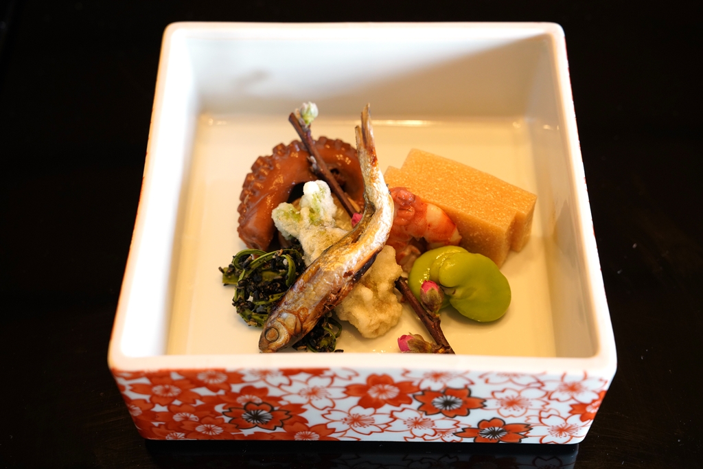 5th course : Broad Beans, Shrimp with Miso Paste, Kogomi seasoned with Sesame, Sea Bream Roe Jelly, Fried Fatsia Sprout, Honmoroko [16/20] – เซ็ตอาหารเรียกน้ำย่อยแบบรวม ได้แก่ ปลาฮอนโมโรโกะย่างแบบทั้งตัว ปลาหมึกยักษ์นึ่งซีอิ๊วกับไข่ปลาหมึกยักษ์ กุ้งราดมิโสะ เจลลี่ไข่ปลาไท่ ผักโคโกมิงาดำและผักทานาโนเมะเทมปุระ หลากหลายและแปลกใหม่มากครับจานนี้