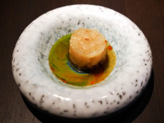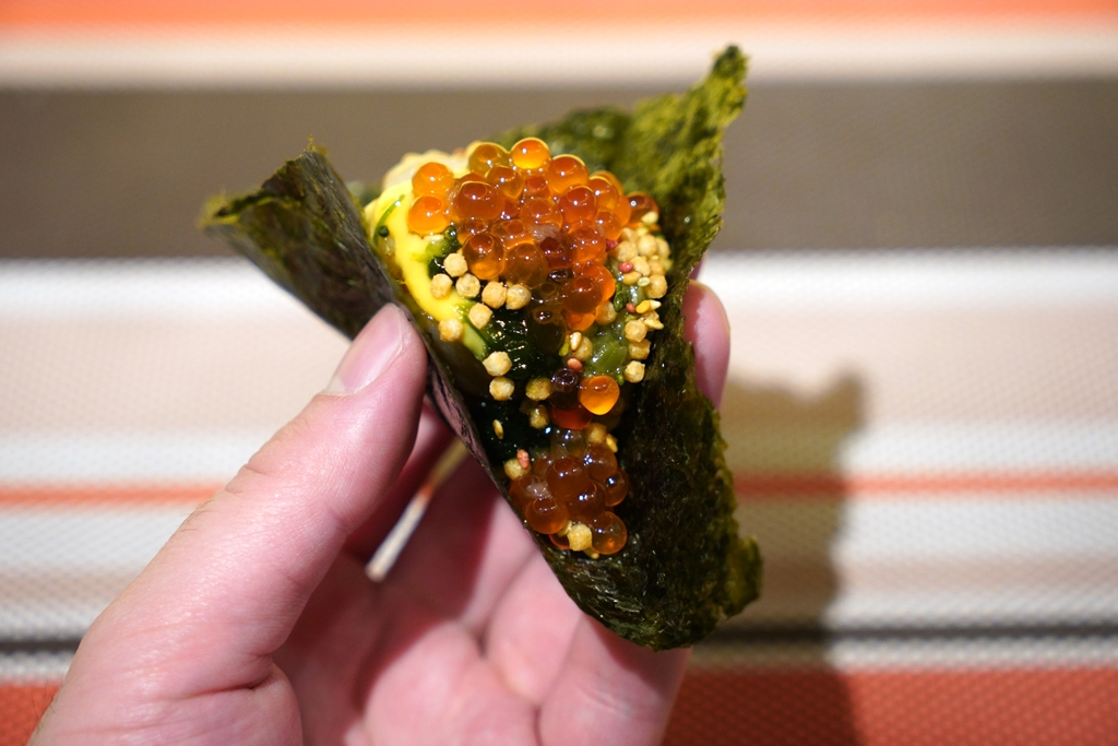 7th course : Hotate [16/20] – มากิหอยเชลล์ย่างตัวใหญ่ห่อสาหร่ายเสิร์ฟกับซอสไข่แดง ไข่ปลาแซลม่อนและข้าวพองกรอบ