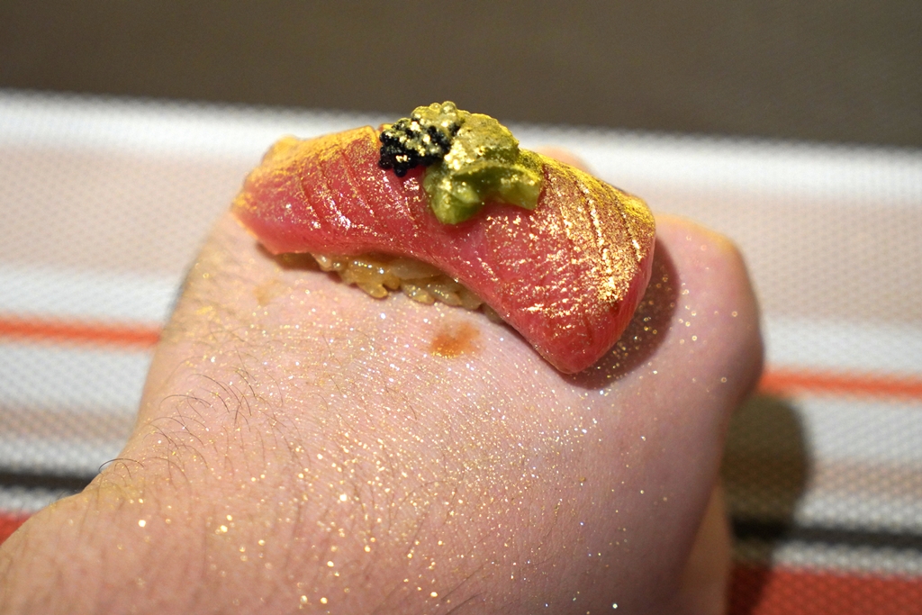 9th course : Chutoro [14/20] – ซูชิหน้าชูโทโร่เสิร์ฟบนหลังมือพร้อมด้วยเปลวทองคำที่เป็นลูกเล่นเล็กๆของร้าน