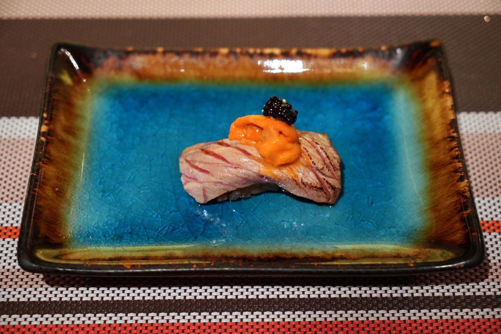 11th course : Otoro & Uni [14/20] – ซูชิหน้าโอโทโร่ย่างไฟเสิร์ฟคู่กับไข่หอยเม่น ไข่ปลาและวาซาบิดอง