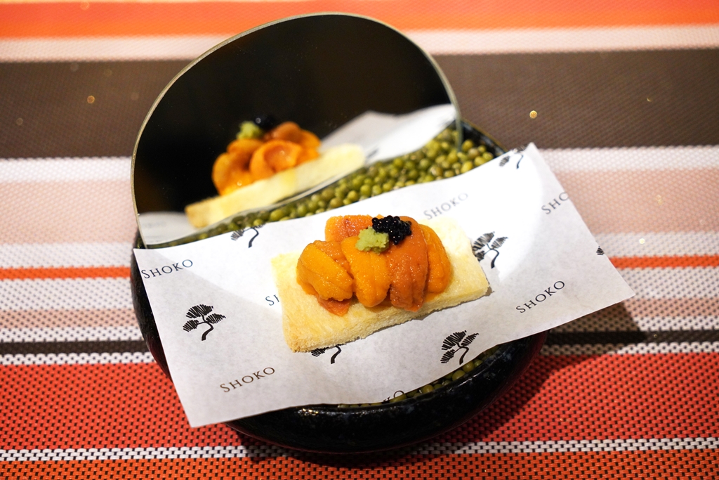 12th course : Uni Shokupan [15/20] – ขนมปังปิ้งหน้าไข่หอยเม่นแบบจัดเต็มเสิร์ฟในจานพร้อมกระจกชวนให้ถ่ายรูปลง Instagram