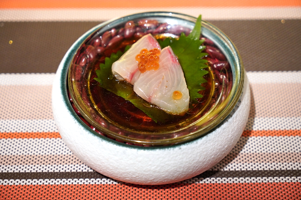 3rd course : Hamachi Sashimi [15/20] – ซาชิมิปลาฮามาจิเนื้อเด้งในน้ำซอสพอนสึรสเปรี้ยวและไข่ปลาแซลม่อน