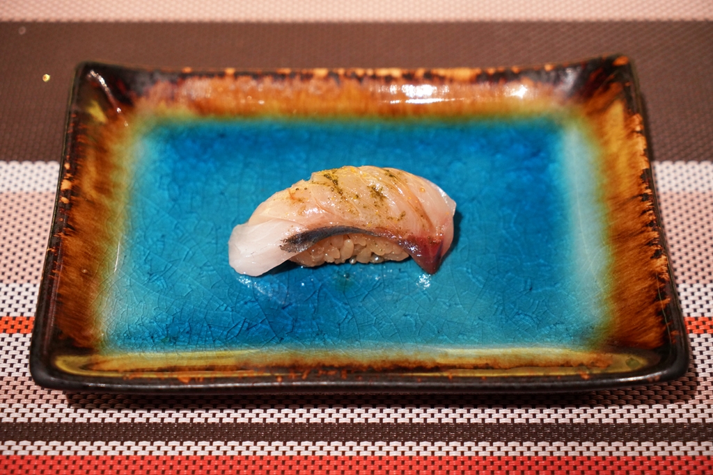 4th course : Shima Aji [14/20] – ซูชิหน้าปลาชิมะอาจิ ปรุงรสด้วยเกลือ มะนาวและผิวส้มยูสุ เนื้อปลาไม่ค่อยเด้งดึ๋งซักเท่าไหร่ครับ