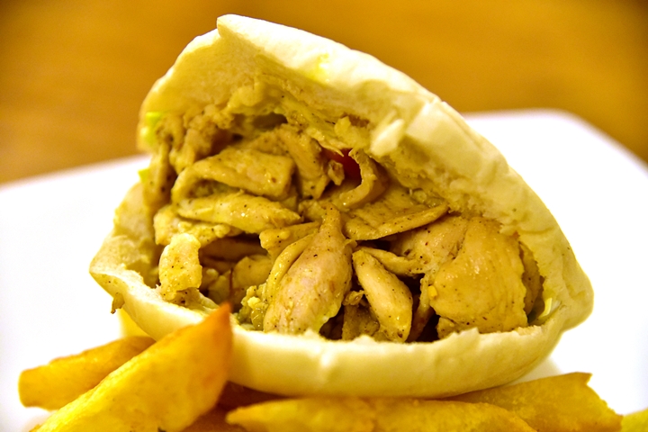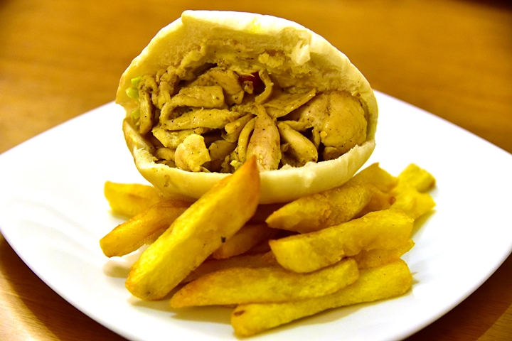 2. Chicken Pita (140 THB) – แป้งพิต้ากระเป๋าสอดไส้เนื้อไก่ผัดสไตล์อิสราเอลและสลัดผักเสิร์ฟคู่กับเฟรนช์ฟรายส์