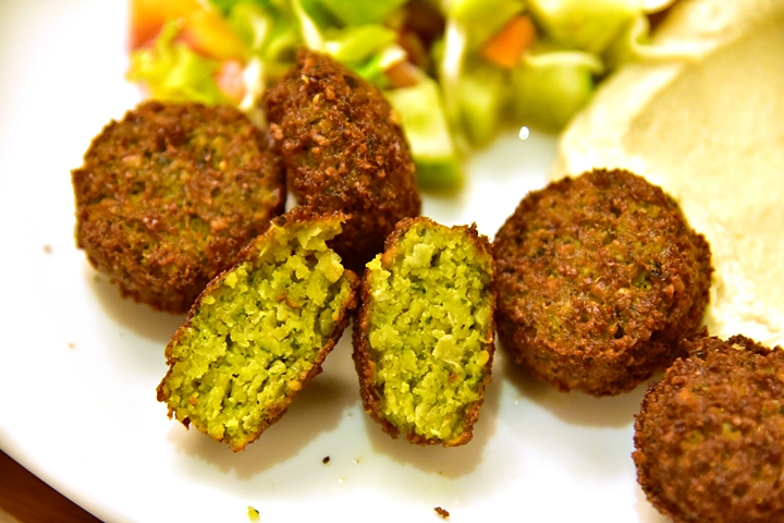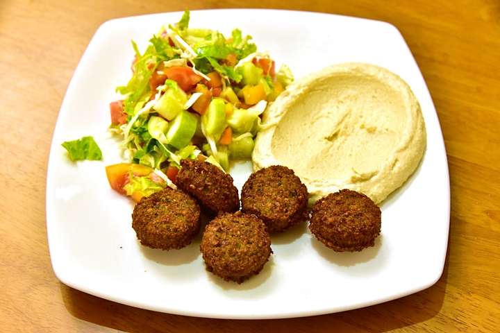 1. Falafel with Salad and Hummus (170 THB) – ถั่วชิคพีบดชุบแป้งทอดกรอบเนื้อนุ่มๆเคี่ยวสนุกเสิร์ฟคู่กับฮัมมุสและสลัดอิสราเอล