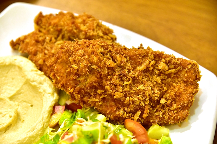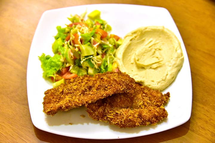 4. Schnitzel with Salad and Hummus (170 THB) – ไก่ทอดแป้งบางกรอบสไตล์เวียนนาเสิร์ฟคู่กับฮัมมุสและสลัด เนื้อไก่มีรสชาติเค็มๆหอมๆ ถือว่าเป็นทีเด็ดของร้านนี้เลยก็ว่าได้