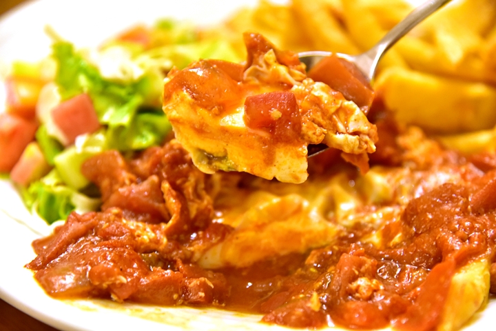 3. Shakshuka with Chips and Salad (160 THB) – ไข่ตุ๋นมะเขือเทศเนื้อเปื่อยนุ่มรสหวานๆเสิร์ฟคู่กับเฟรนช์ฟรายส์และสลัดอิสราเอล